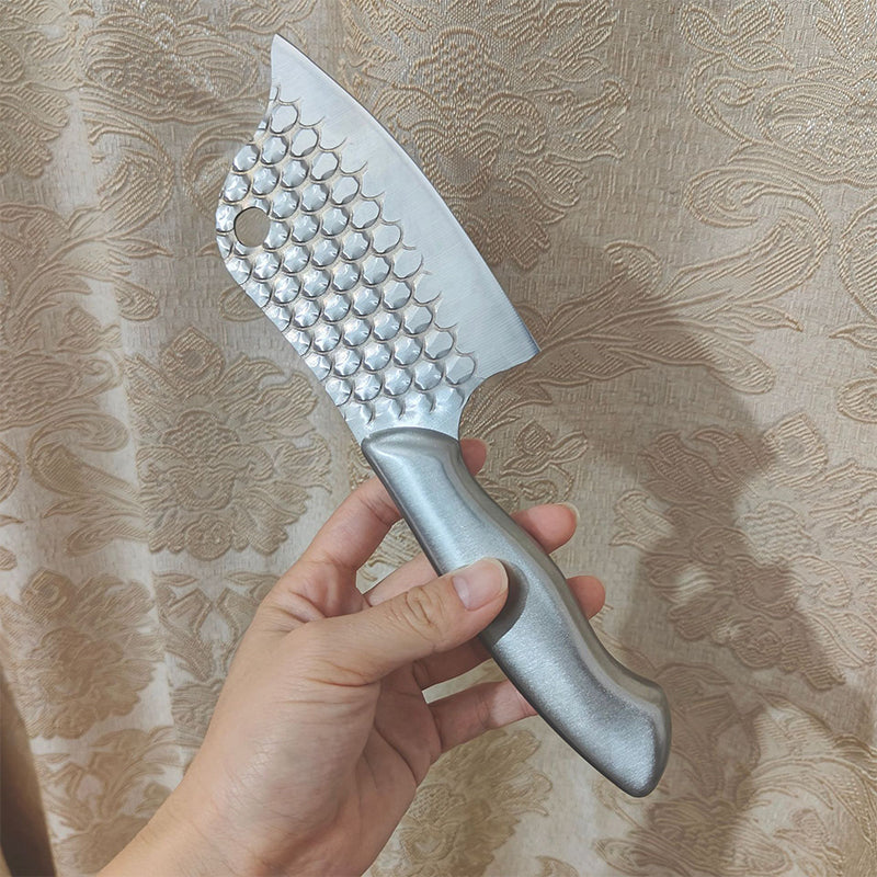 Embossed dragon scale texture on the blade creates tiny air pockets between the knife and food – eliminating sticking and reducing friction! Slice veggies, dice meat, or gut fish without messy buildup, ensuring clean, precise cuts every time. No more scraping food off the blade mid-prep.